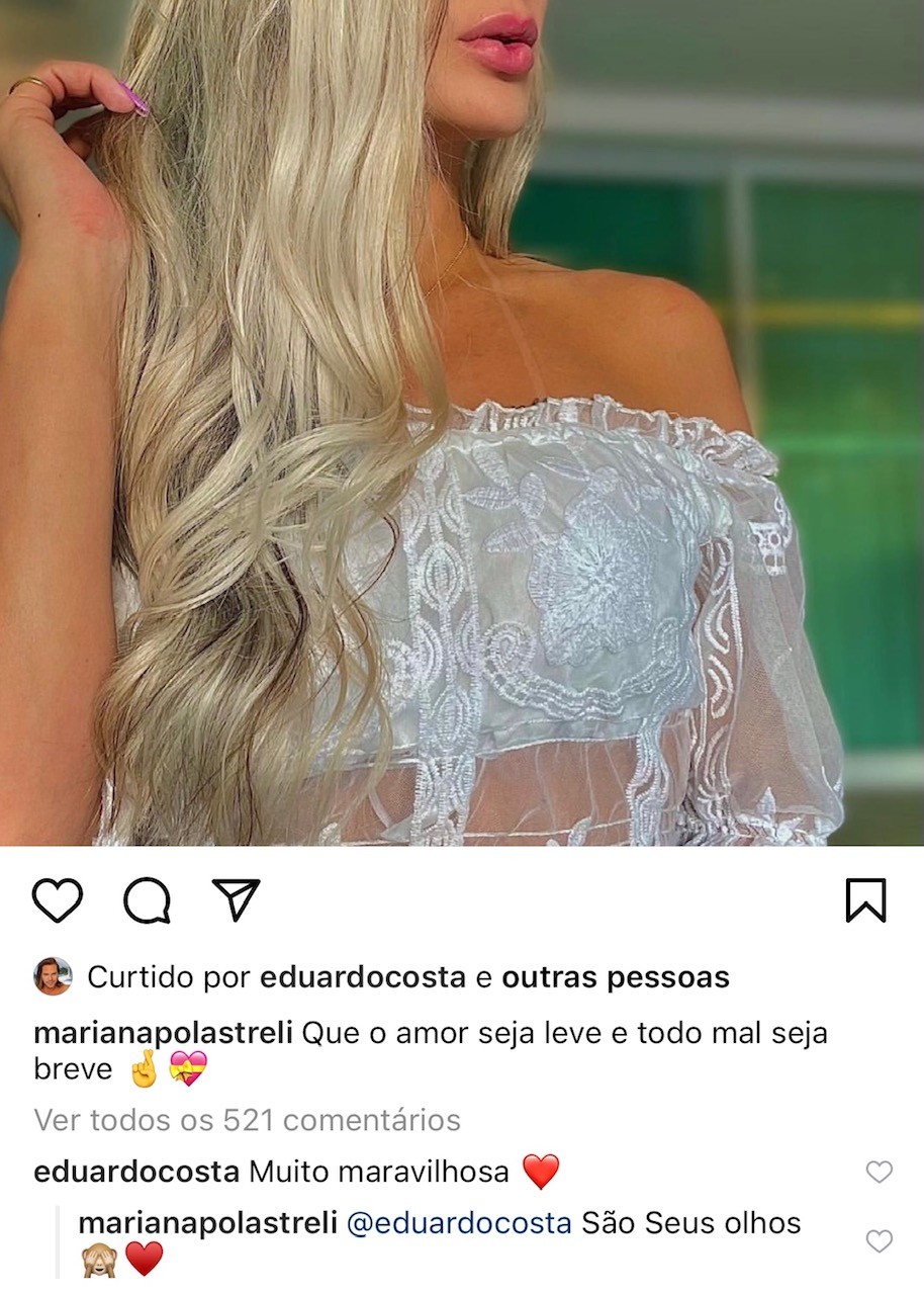 Eduardo Costa troca declarações com affair casada: Mariana publicou uma foto em seu perfil no instagram, com a legenda “Que o amor seja leve e todo mal seja breve”. Os internautas encheram a foto da influencer de curtidas e comentários e o sertanejo também resolveu se declarar “Muito maravilhosa”.